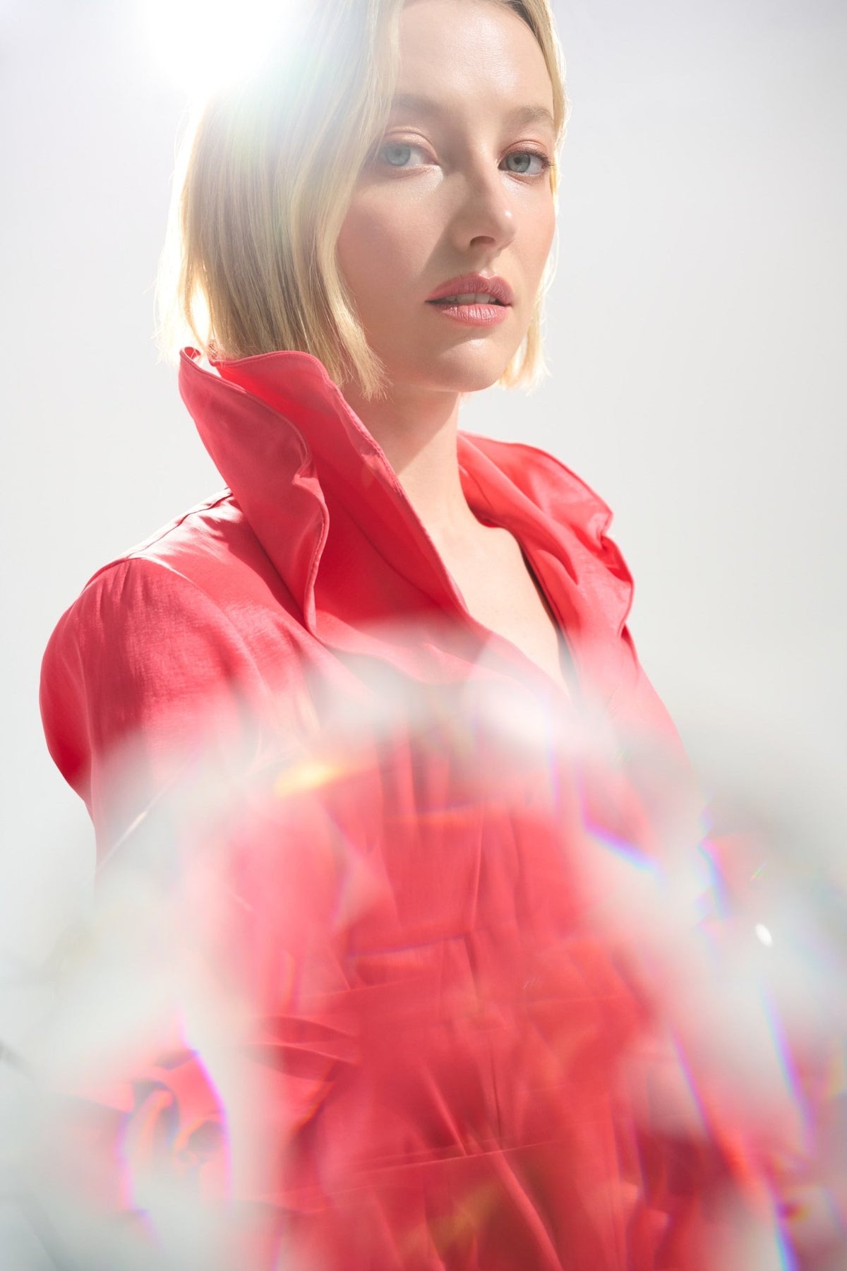 This stretch taffeta dress in coral exudes sophistication with its sculpted yet fluid design. Featuring a wired double lapel collar and a waist-defining sash, it elegantly flatters the silhouette. The pleated skirt adds graceful movement, while the rhinestone zipper pull offers a subtle, refined detail. A standout piece from the Signature collection, perfect for making a confident impression.