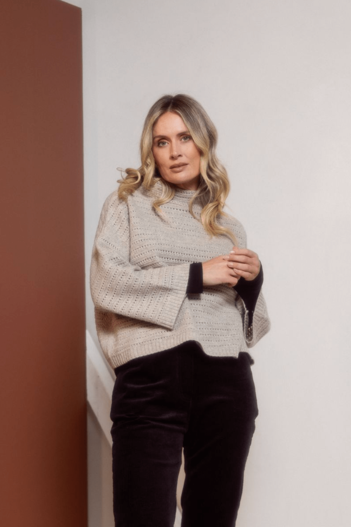 See Saw's pointelle knit combines understated elegance with everyday comfort. Crafted from a premium blend of wool, nylon, and acrylic, this knit features a relaxed drop shoulder silhouette and a refined funnel neck. The delicate pointelle texture adds visual interest while the long sleeves provide versatile layering. Perfect for transitional dressing, this piece moves effortlessly from casual to polished occasions.