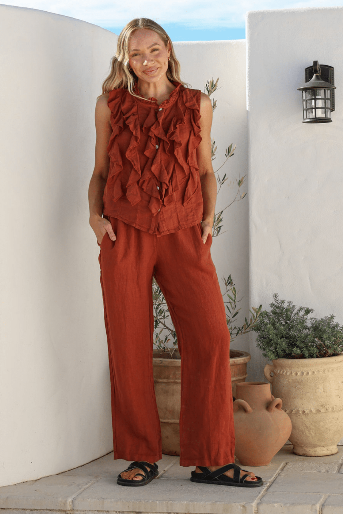 Add a pop of personality to your wardrobe with the Parigi Linen Top! Featuring a playful ruffle front and a button front, this sleeveless top is made from 100% linen, perfect for keeping you cool and stylish. Available in more beautiful season colours.