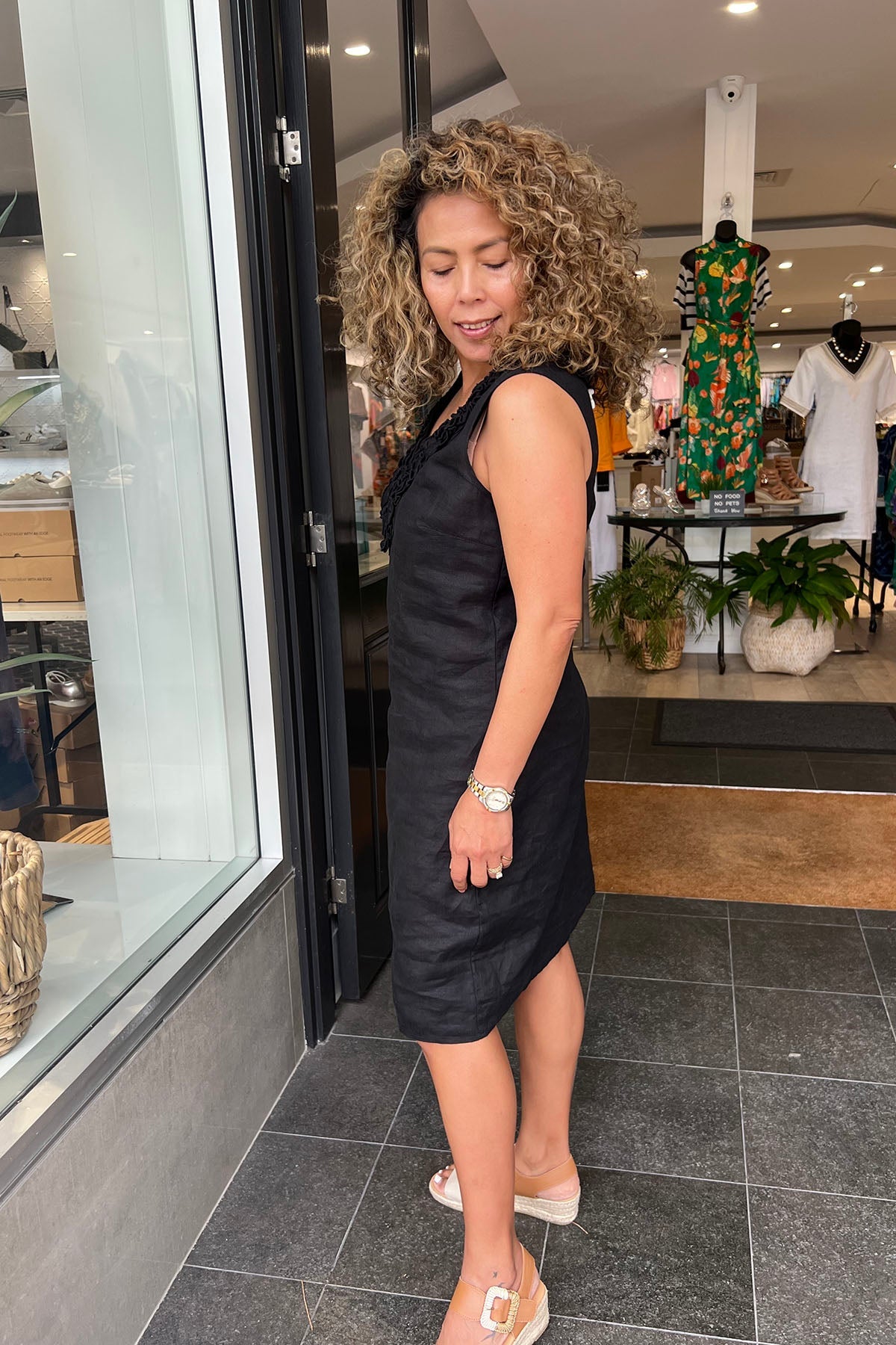 This black sleeveless linen dress features a sophisticated V-neck and delicate ruffle detailing on the chest, combining elegance with breathable comfort. Its lightweight linen fabric ensures a cool, airy feel, making it ideal for warm weather or layered styling. Perfect for those seeking a refined yet effortless look.
