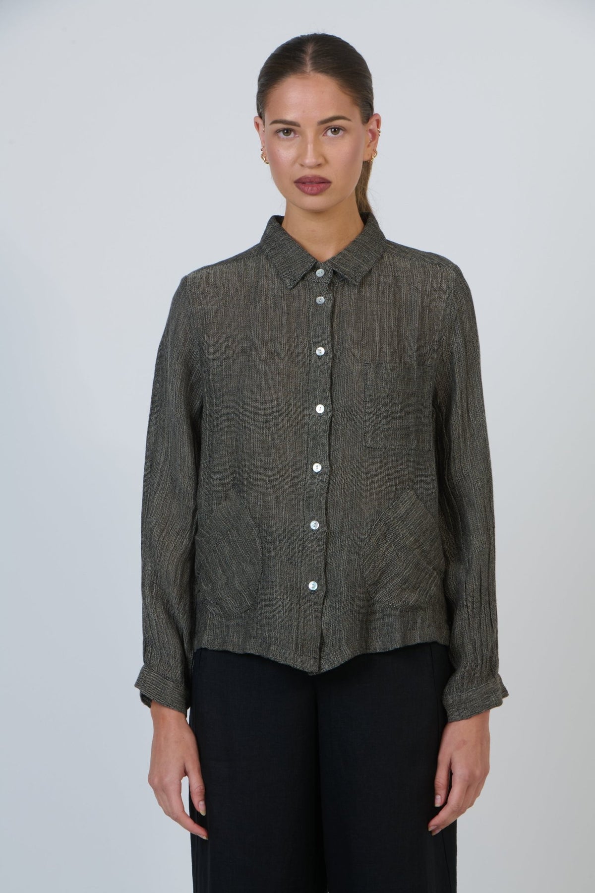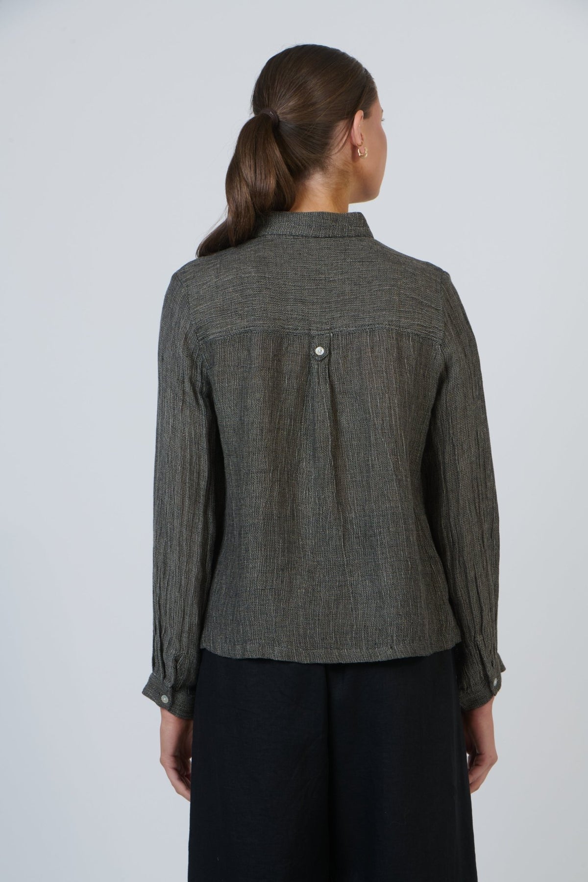 GA544 Linen Top in Mussell showcases refined tailoring with Full length button sleeves and a graceful Collared neckline shell button closure and inverted box pleat at the back add understated sophistication. Crafted entirely from breathable 100% linen, this piece transitions effortlessly from season to season, offering timeless elegance with contemporary design details.