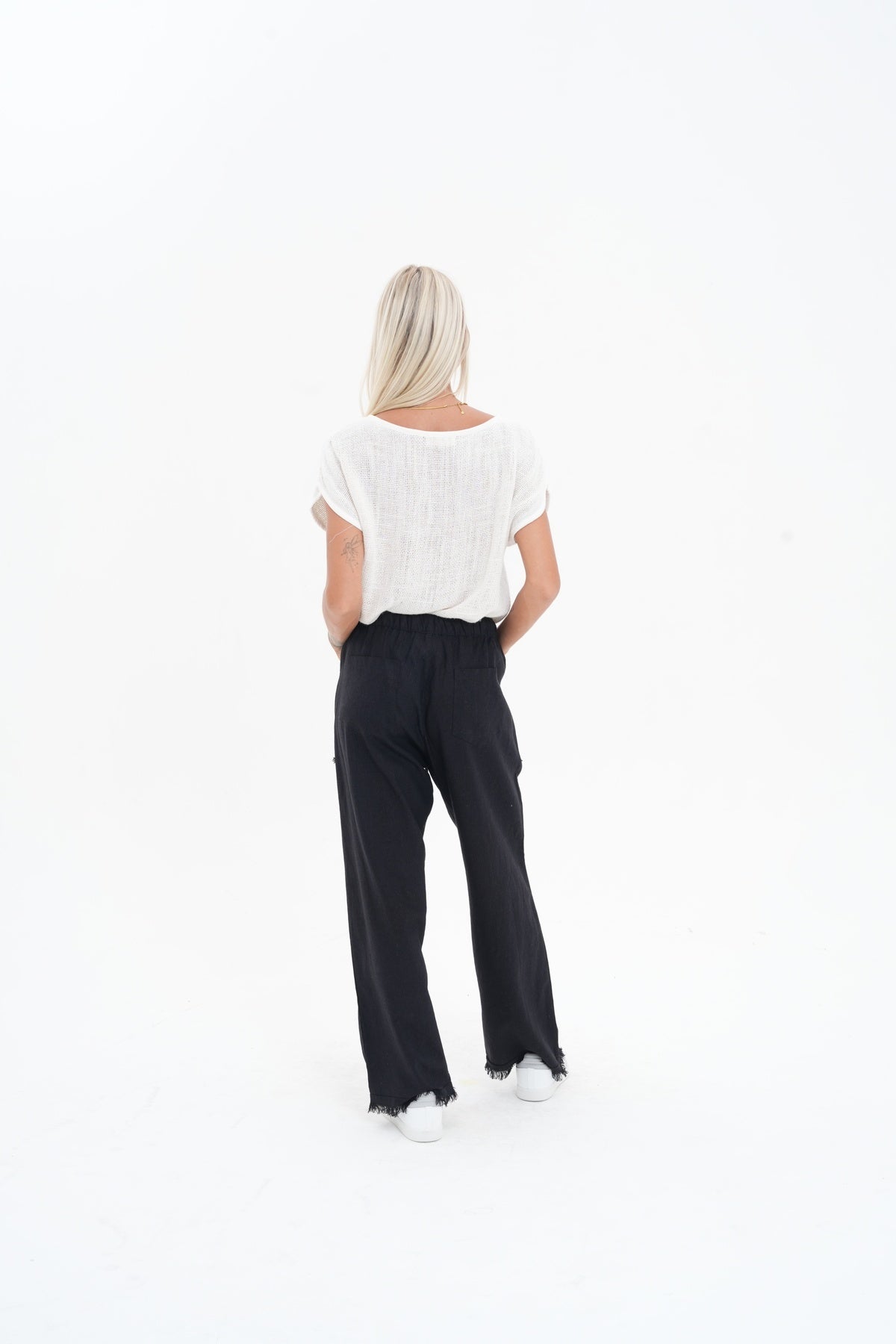 The Joshua Frayed Linen Pant in Black offers a relaxed fit crafted from breathable linen fabric, ensuring comfort throughout the day. Its soft elastic waistband provides flexible wear, while the front pocket adds practical functionality. Ideal for casual or refined looks, these pants balance effortless style with everyday ease. Carbon the Label have added their touch of pizazz with a fray hem detail adding a boho fun weekend pant