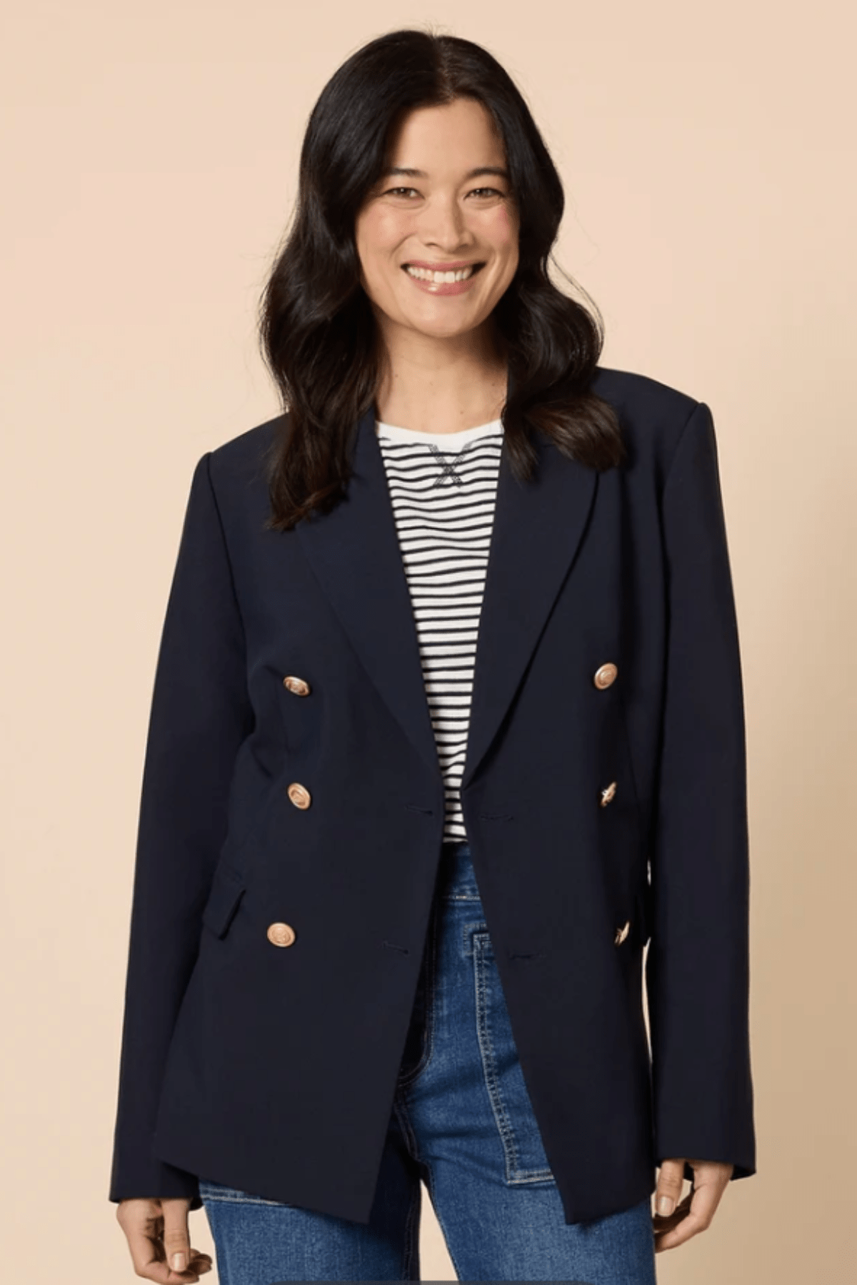 The Newport Blazer is your new best friend for looking effortlessly put-together. Double-breasted with eye-catching gold buttons, it's got that polished edge that works whether you're dressing up or keeping it casual. The structured yet stretchy fabric means you get sharp tailoring without sacrificing comfort—think crisp lapels, full sleeves, and pockets that actually work. Layer it over a striped tee and jeans for weekend cool, or throw it on with tailored trousers when you need to mean business. One blazer, endless outfit possibilities.