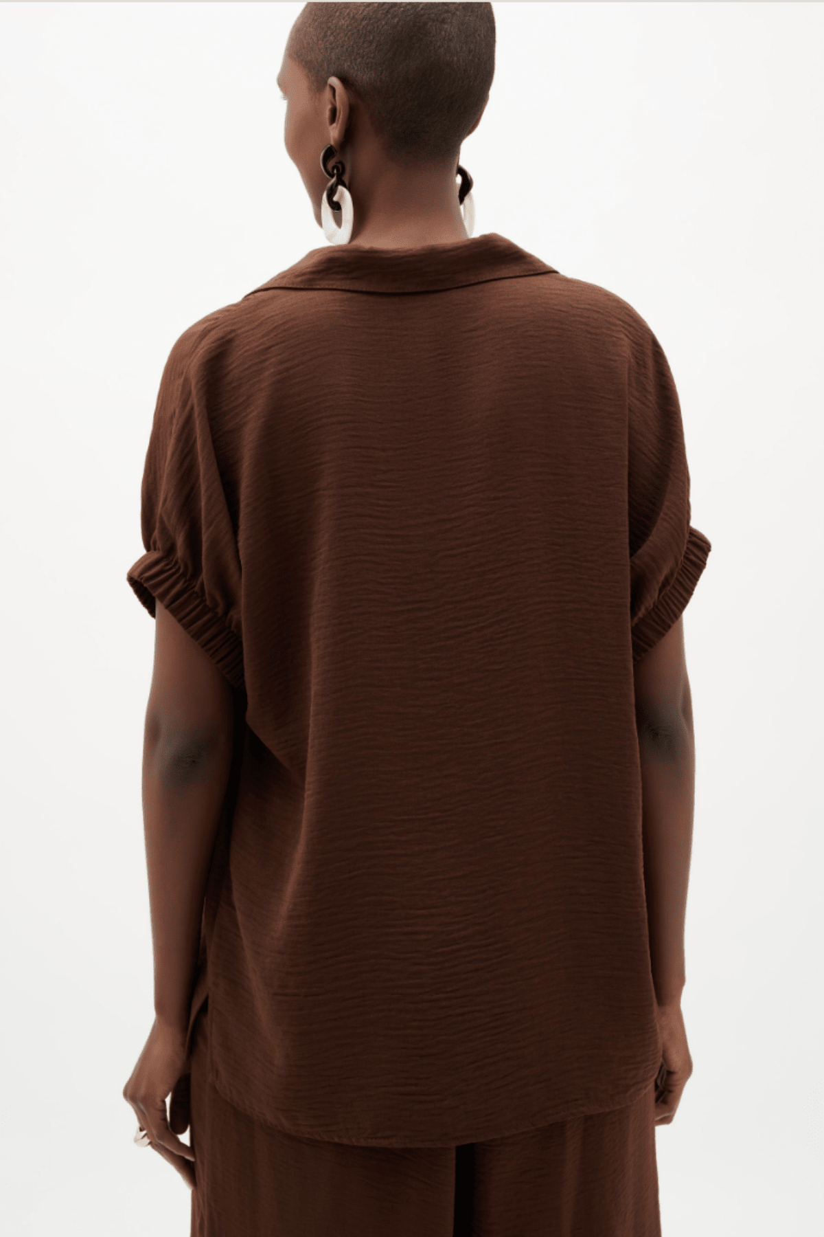 Effortlessly chic and wonderfully breathable, the Cally Top brings relaxed sophistication to your everyday rotation. Crafted from lightweight woven gauze, this boxy silhouette features a flattering V-neckline framed by a crisp shirt collar and wide band. Dolman sleeves with shirred elastic cuffs offer a gentle, comfortable fit, while strategically placed side slits provide movement and ease. Unlined for maximum airflow, it's the perfect layering piece or standalone statement for warm-weather dressing with an edge.