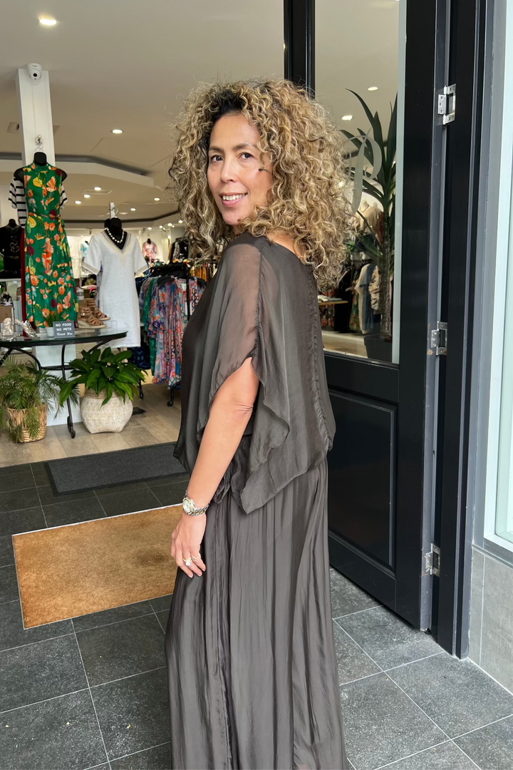 Elevate your wardrobe with the Audrey Silk Top in Chocolate. This refined piece features a smooth silk body enhanced by a soft viscose underlay for added comfort. The open flutter sleeves add a delicate, airy touch, perfectly complementing the elegant round neckline. Ideal for sophisticated, effortless style.