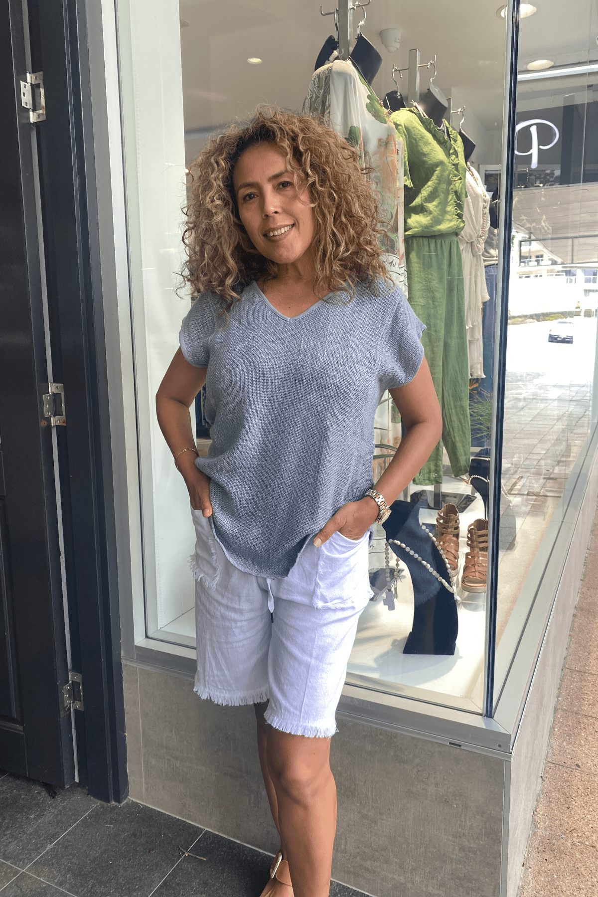 The Lyra Hessian Top in Slate Blue by Carbon showcases elegant simplicity with its lightweight 100% rayon fabric and subtle open weave, perfect for warm days. Featuring a refined boat neckline, this summer shirt combines effortless style and comfort, ideal when paired with a skirt, shorts or jeans and sandals for a polished, yet relaxed look. This top has more length the paris top my Carbon.