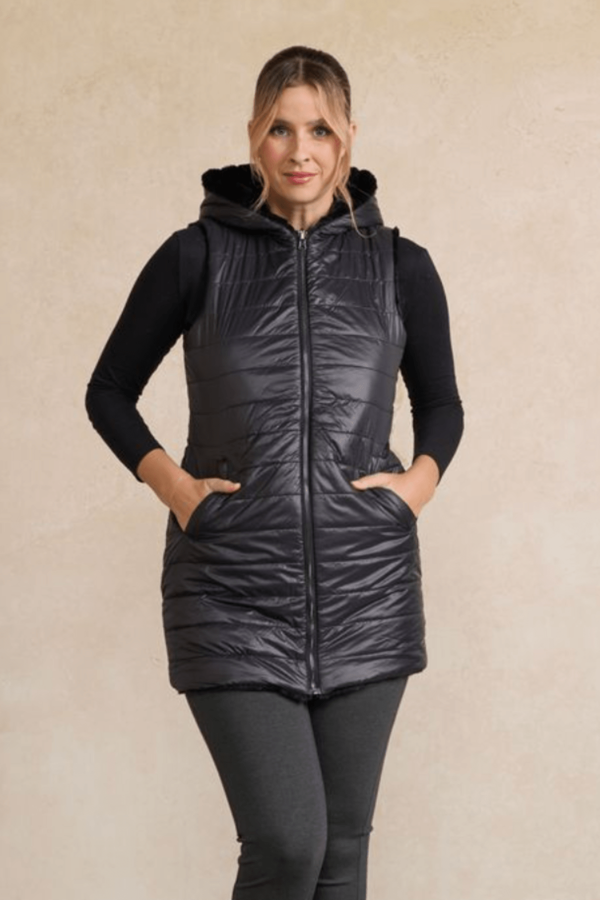 Elevate your layering game with this Caju reversible vest, designed for versatility and comfort. Switch between luxe faux fur and sleek puffer finishes depending on your mood or occasion. Crafted from polyester and nylon with a soft, touchable handle, this piece features a protective hood, convenient inset side pockets, and a smooth zip front closure. Perfect for transitional weather or adding dimension to any outfit.