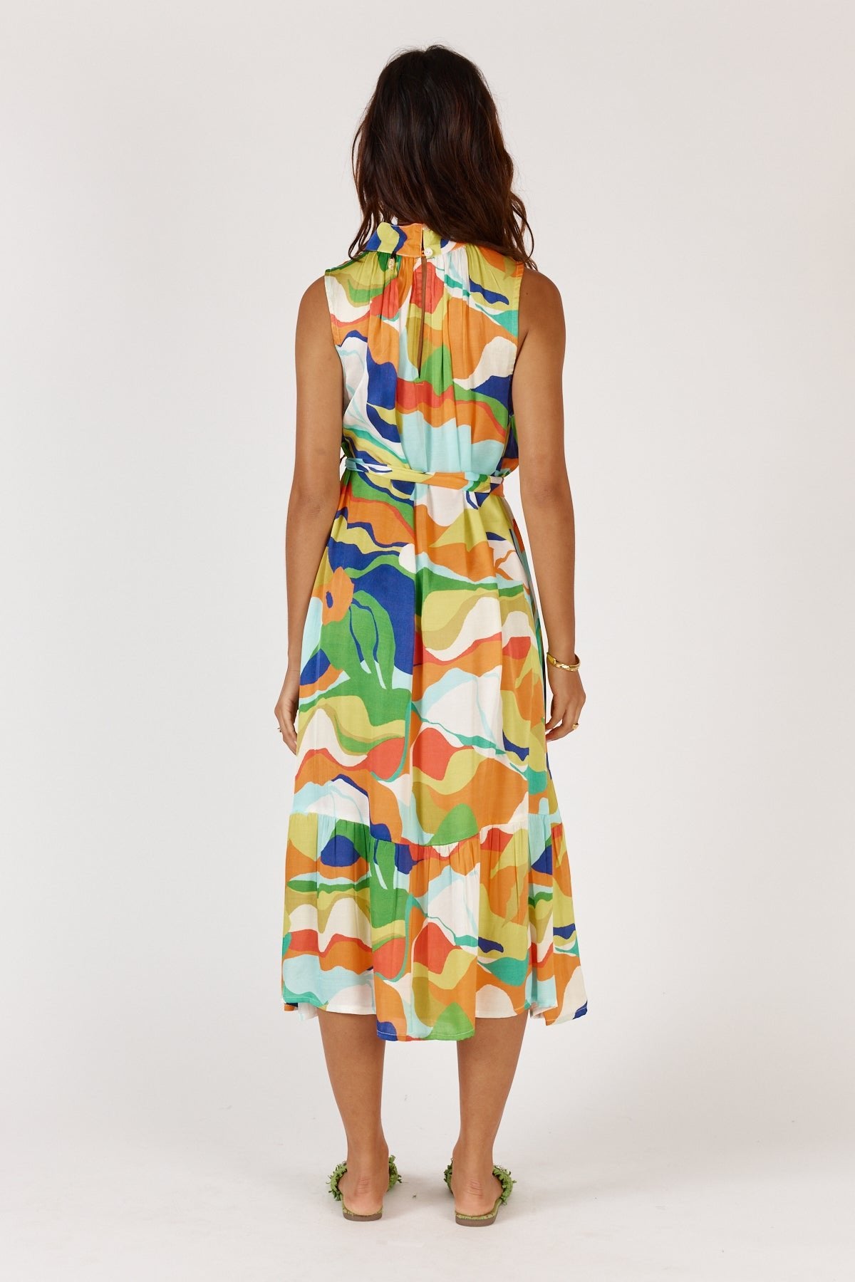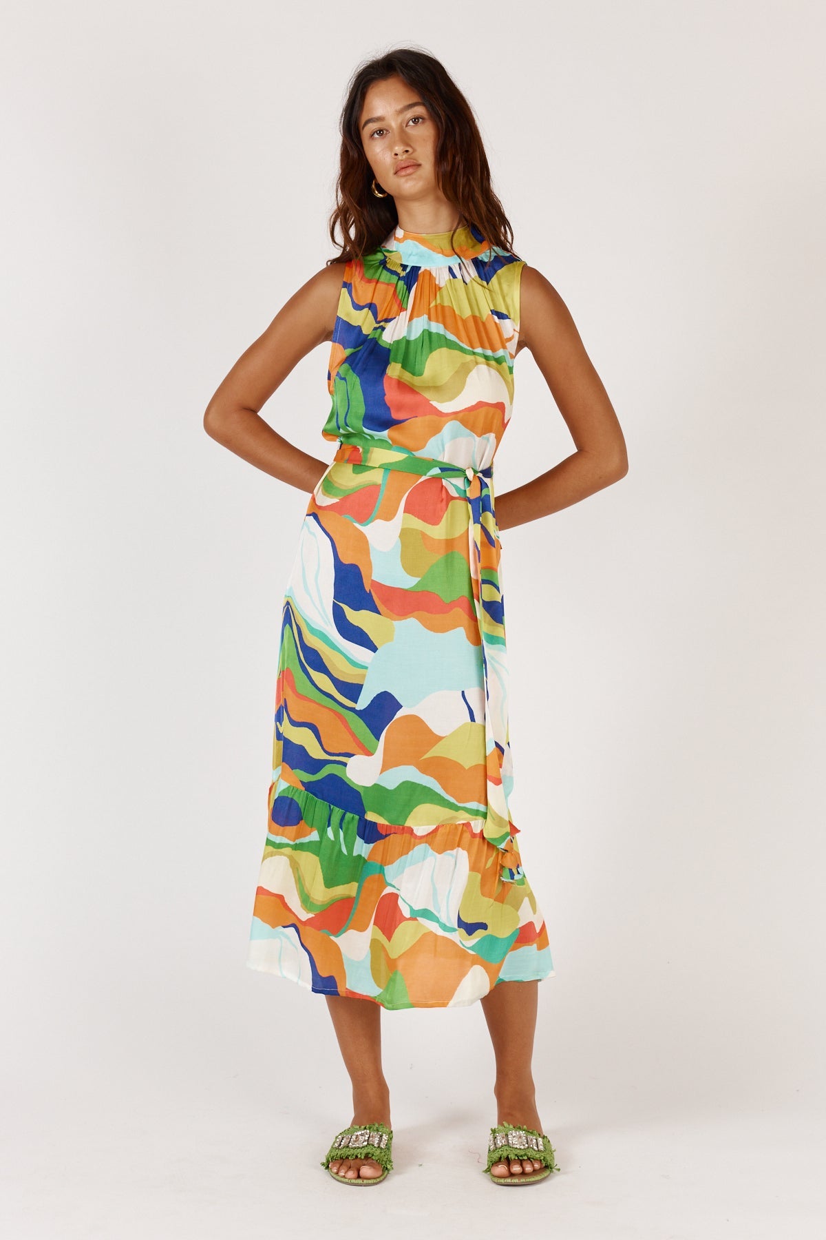 Embrace sophisticated style with the Wild Safari Halter in Camel. Made from 100% viscose satin, this midi dress offers a high neckline and sleeveless design, enhanced by a tasteful back neck opening. Its relaxed fit provides effortless comfort, while the separate self-tie belt lets you elegantly shape your figure. Perfect for special occasions or refined daytime events, this piece showcases modern Australian craftsmanship with a luxe finish. Complement it with heels or sandals to complete your polished look.